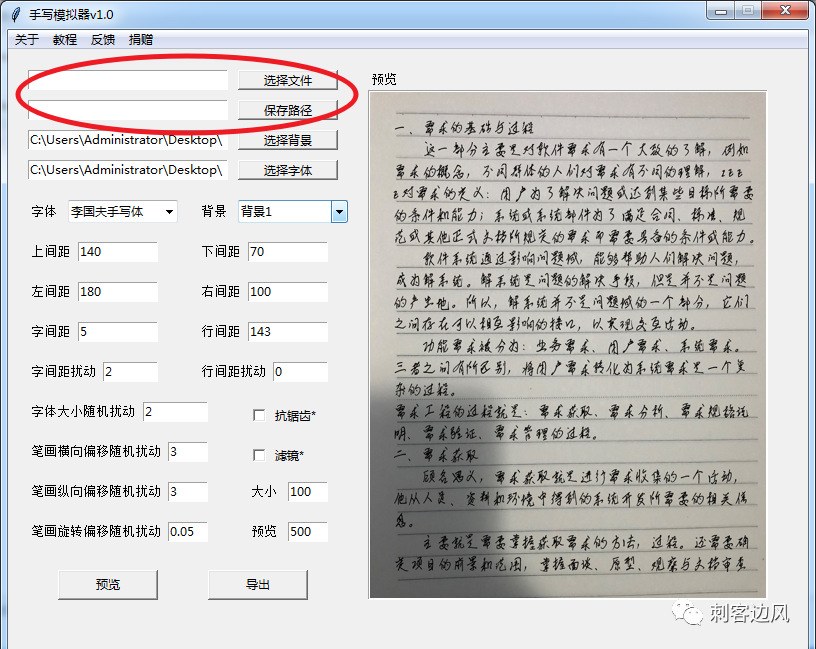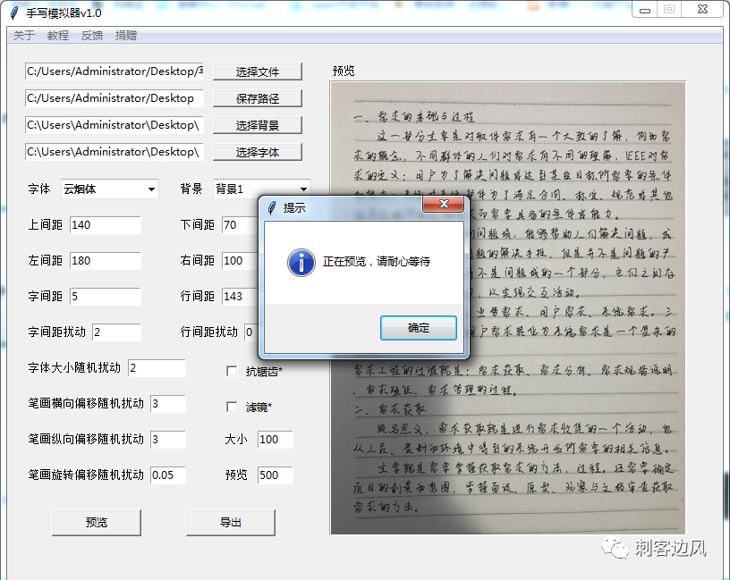 首次打开软件,需要先设置一下路径,把需要转换成手稿的电子版文件准备好,然后点击选择文件,导入上传后,静候片刻,即可转换成手写字体。