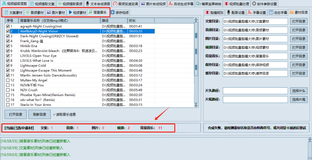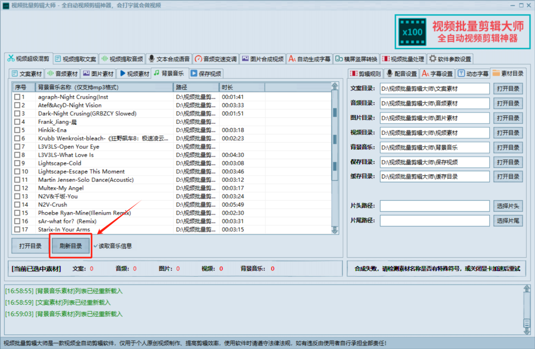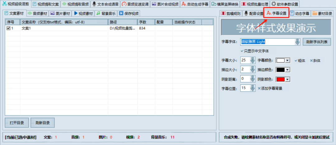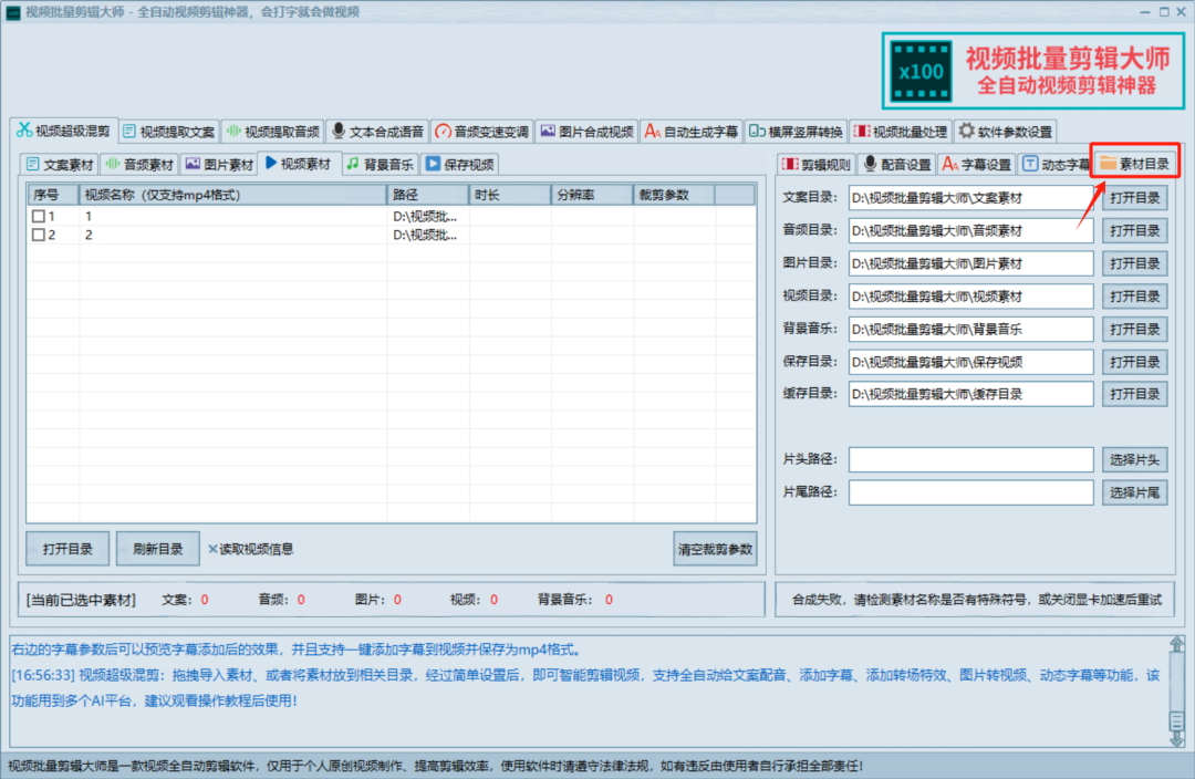 打开右方的目录按钮,可以自动跳转到文件夹具体位置,然后将我们需要制作的素材,通通对应放入,这里需要注意的是视频素材目前仅支持MP4,音频素材为MP3,文案为TXT,记得事先转换对应格式。