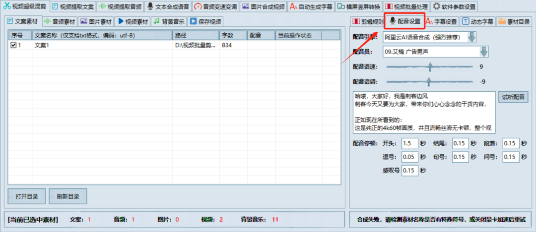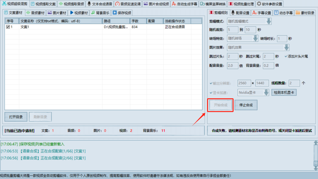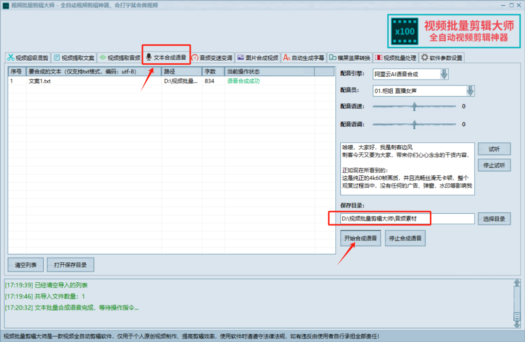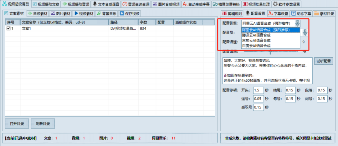 除了自动剪辑之外,软件比较大的一个亮点,是自带了文本合成语音功能,就是我们常说的文字转语音,使用起来也很简单,直接将文案文本拖拽进去,点击右下角的开始合成语音即可。