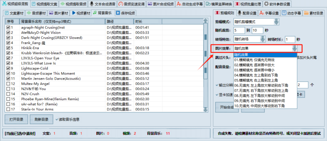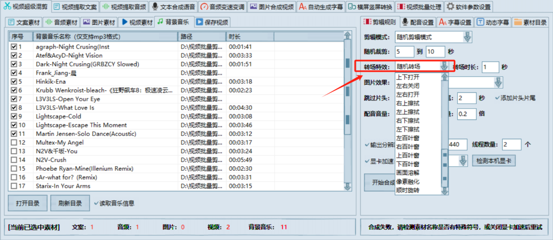 转场特效很好理解,这里使用随机就可以。