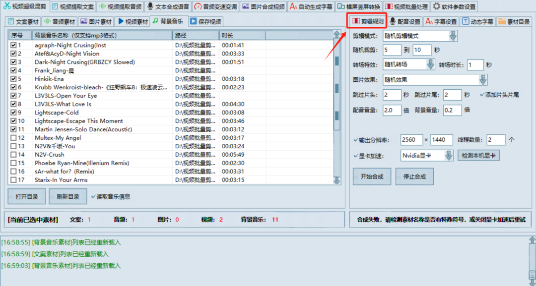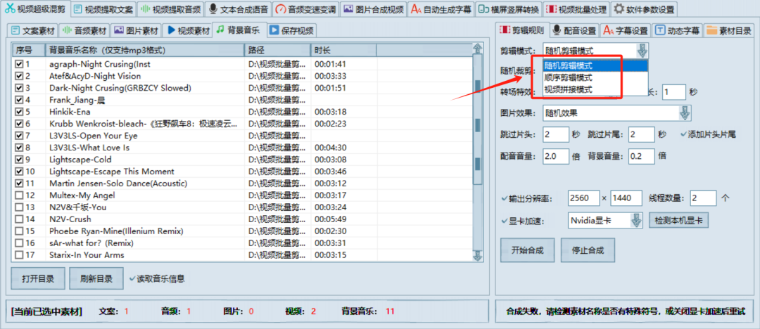 这里面比较重要的,是它的剪辑模式,对于正常剪辑来说,用随机就可以了;但如果是影视、动漫博主,尤其是完整连续剧那种,建议使用顺序剪辑模式;像卡点混剪类的,使用拼接模式。