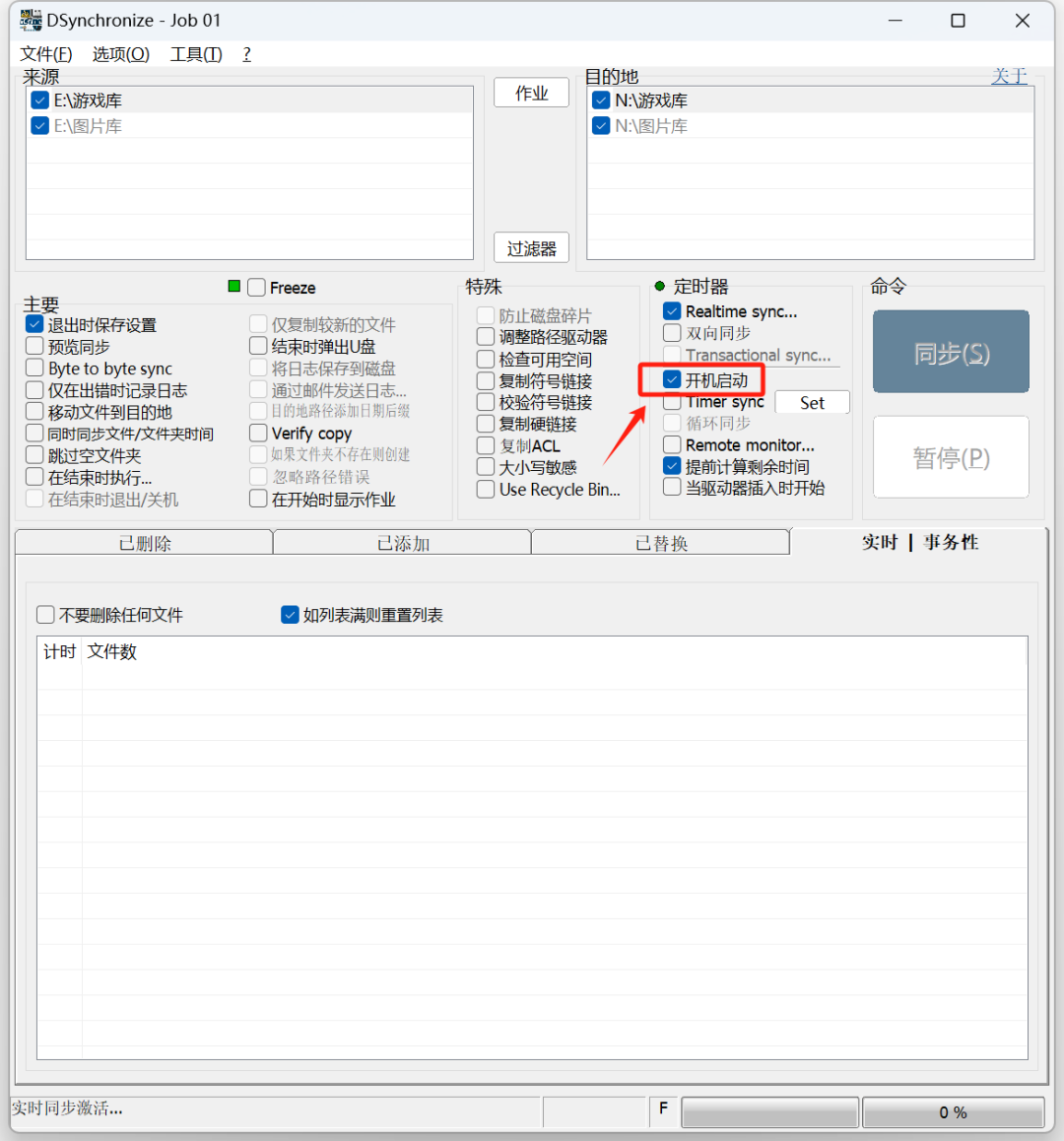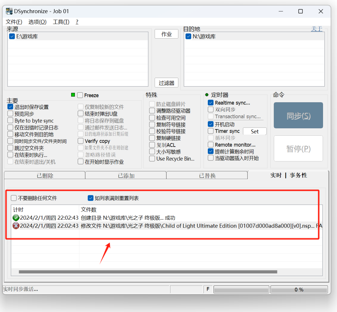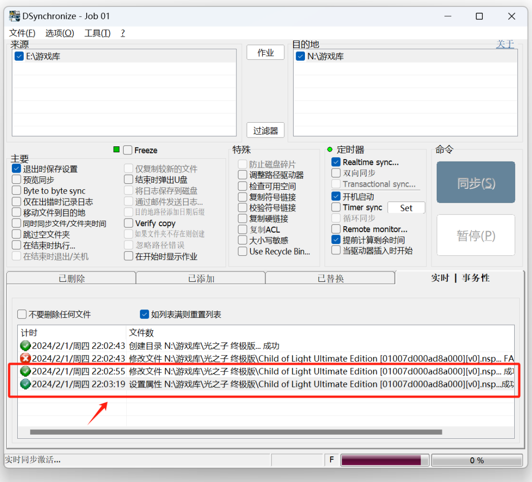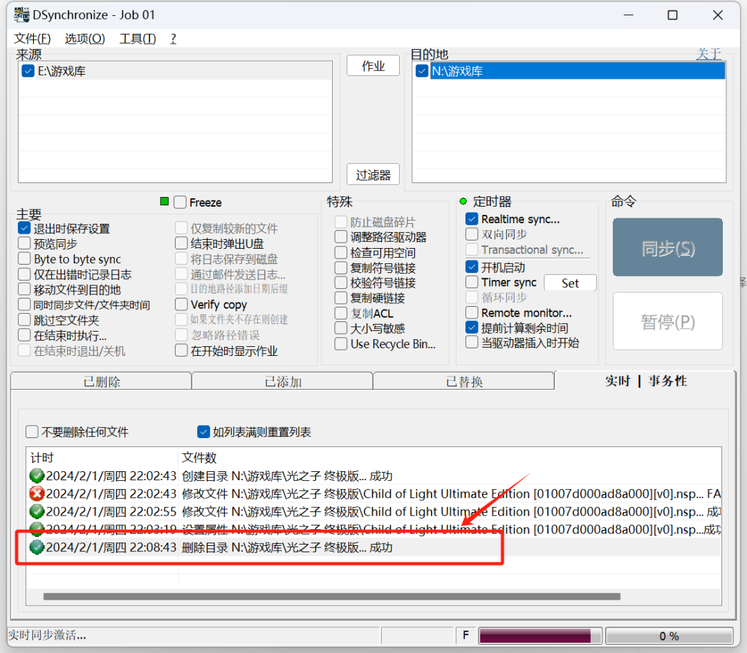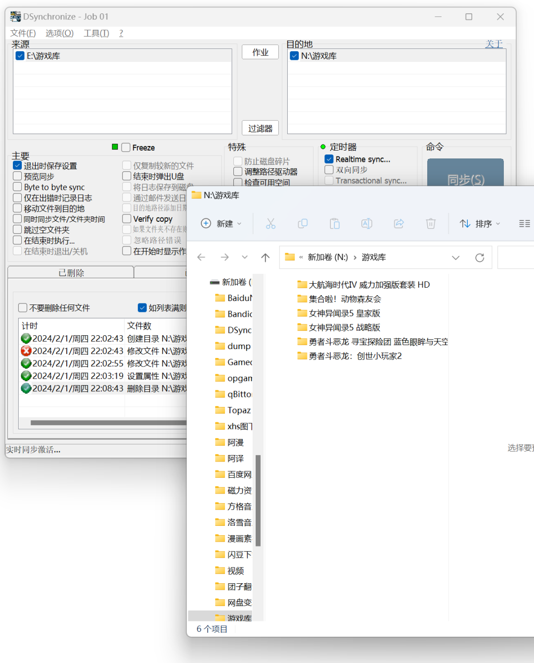当我们启动之后,只要在源文件夹里做的任何操作,它都会同步反馈给目的地文件夹里。