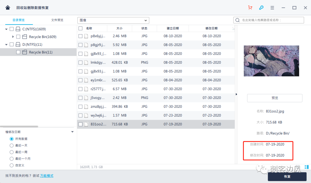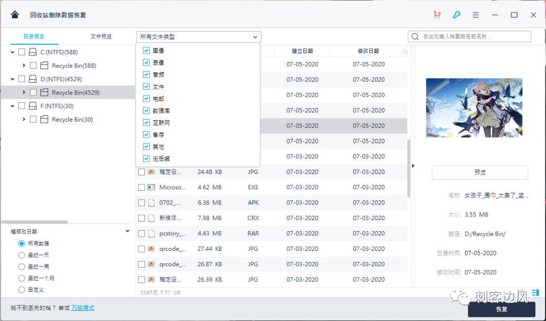 扫描完成后,可以预览相关文件,能完整显示出大小、路径、创建时间等信息,方便我们查询,如果恢复的文件太多无法用名称辨别,也可以通过类型进行筛分,比如:图片、音频、文件等类别。