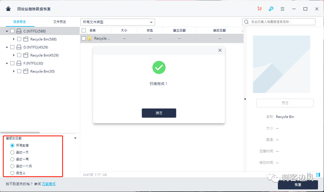 不论是使用其他工具彻底删除的文件,还是回收站里清空的文件,甚至是格式化、数据丢失,硬盘坏道等所有的数据都能有效进行恢复,即便不知道要恢复何种数据,也可以直接使用最后一个选项:万能模式。