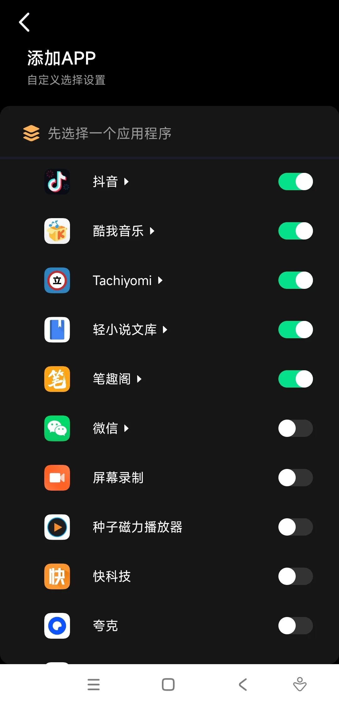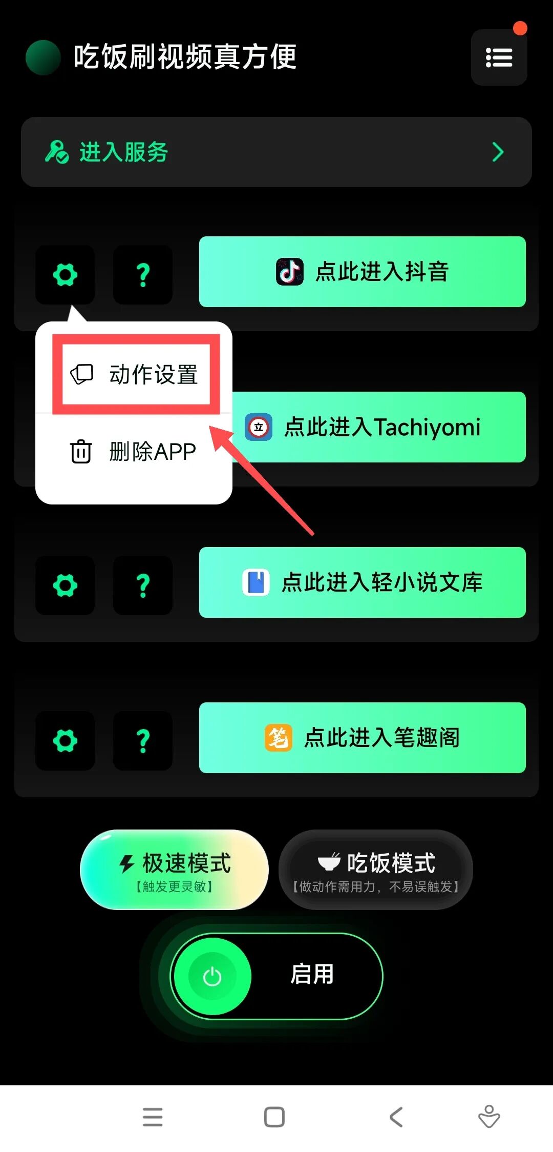 需要说明的是,软件并不单单可以用来看短视频,任何你手机上已经安装的APP都可以设定相应操作: