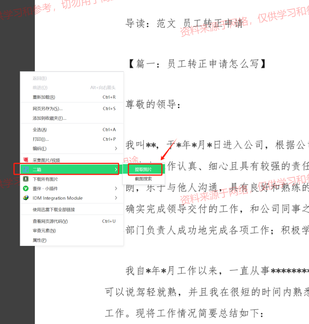 但仅仅这样,还远远不够,所以我们现在要用刺客提供的第2个浏览器插件,在空白位置,按鼠标右键,弹出的菜单里选择提取图片:
