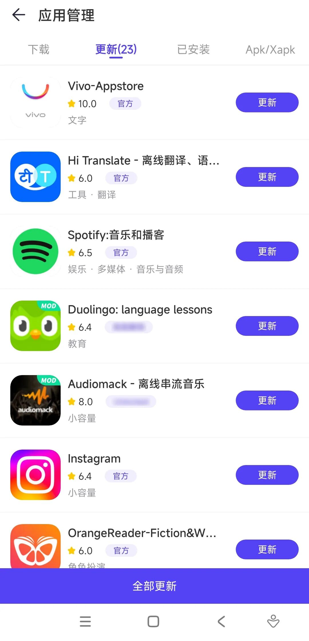 也能管理自己手机上已安装好的应用程序,并批量更新。