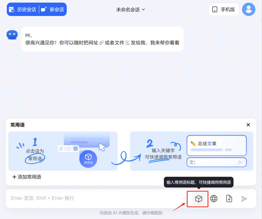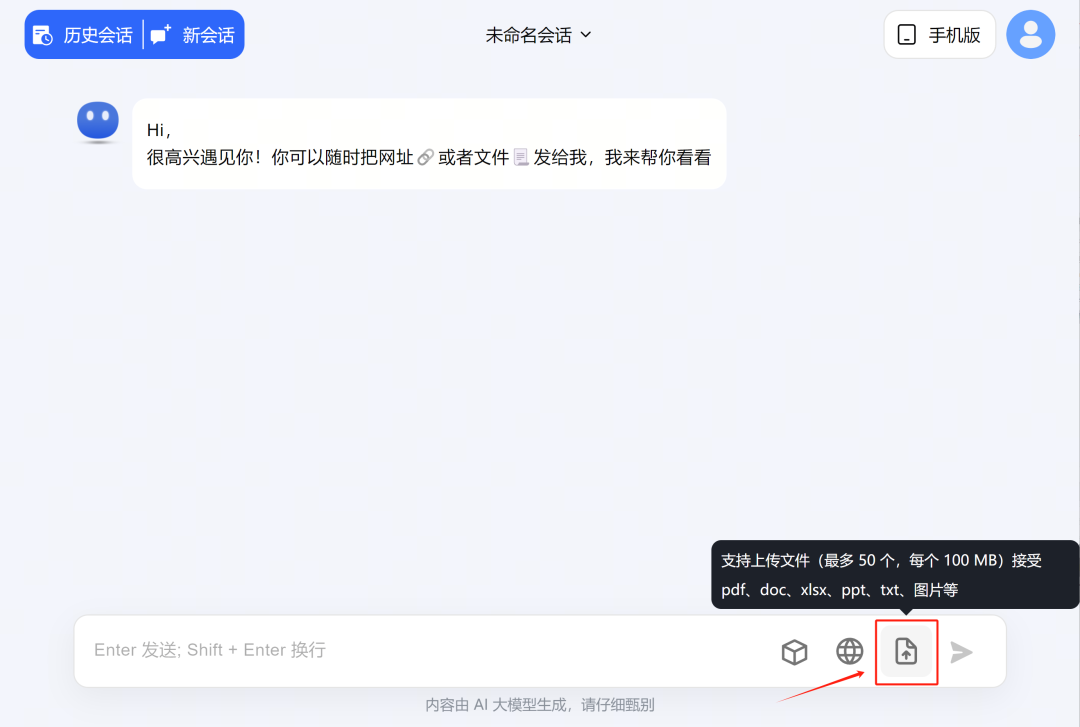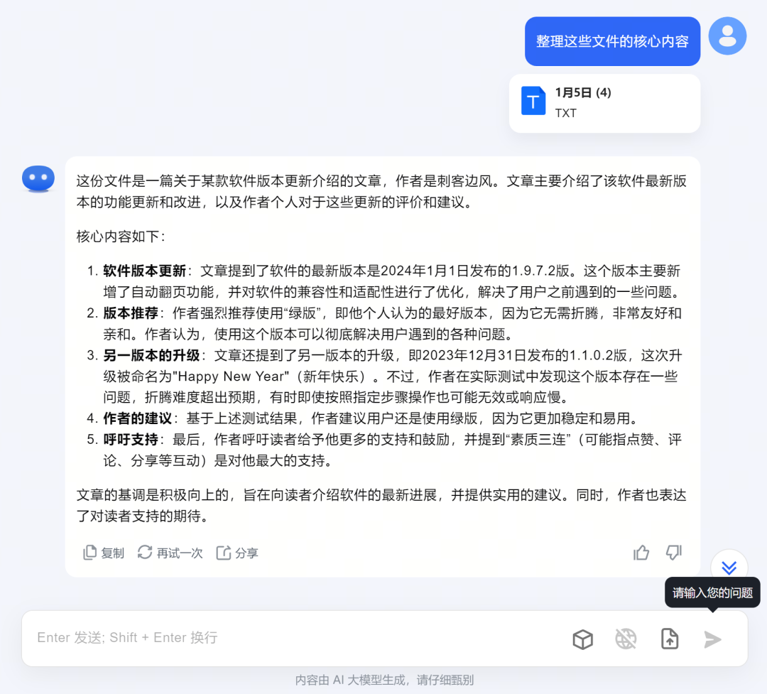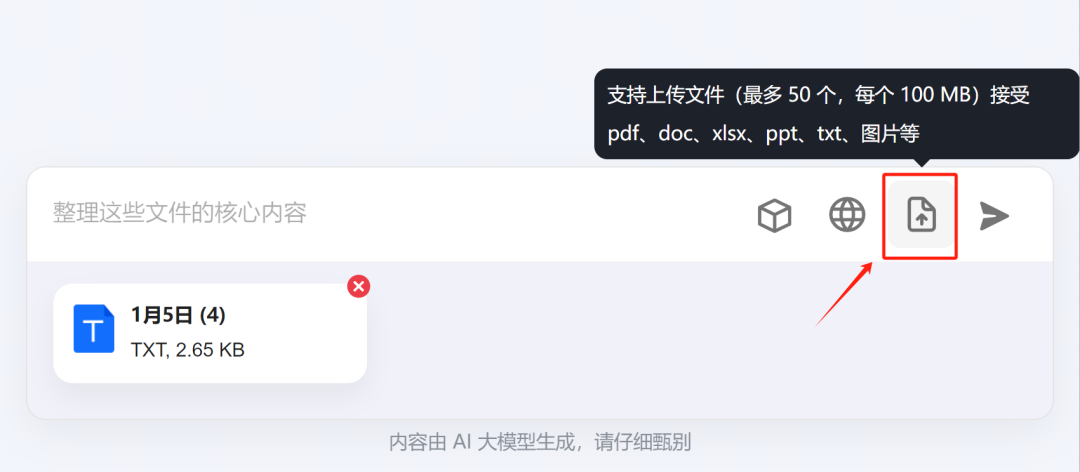 不仅如此,它甚至支持上传本地文件,包括:PDF、DOC、XLSX、PPT、TXT、图片等等,这个功能主要用于:提炼总结。