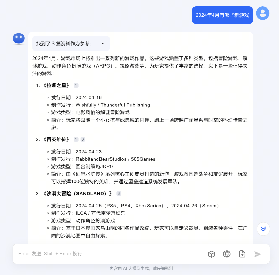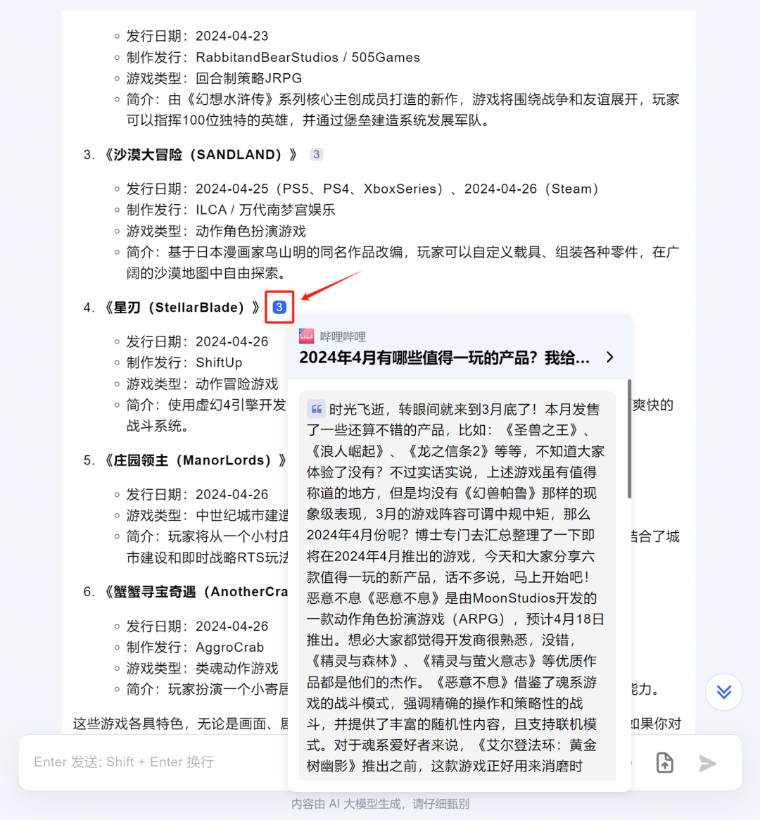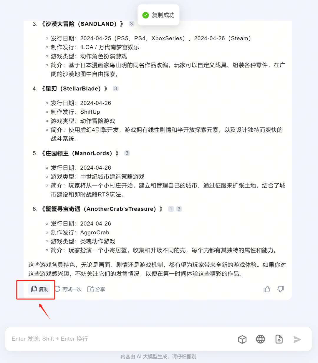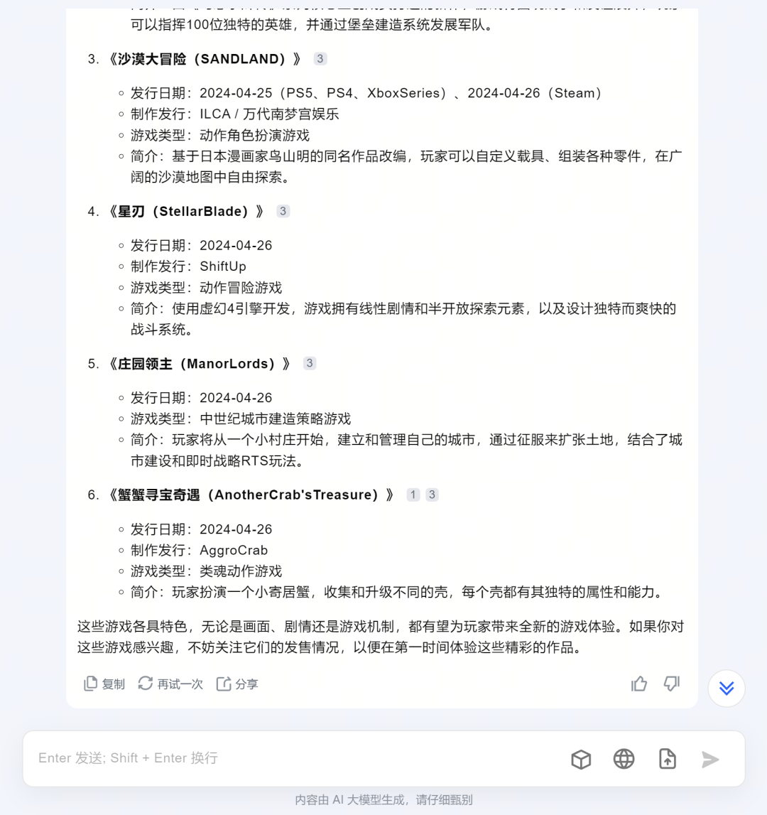 举个例子,比如刺客要做4月新游戏推荐,那么很简单,只需要复制粘贴,它就是一个不错的视频文案脚本,将这些内容朗读出来,并配上对应画面,一条游戏视频推荐就完成了: