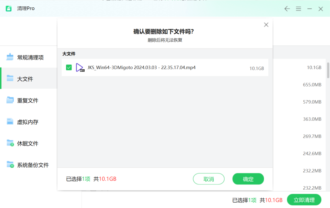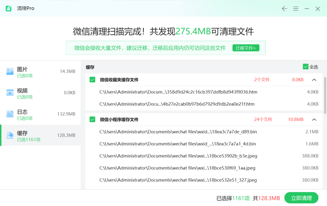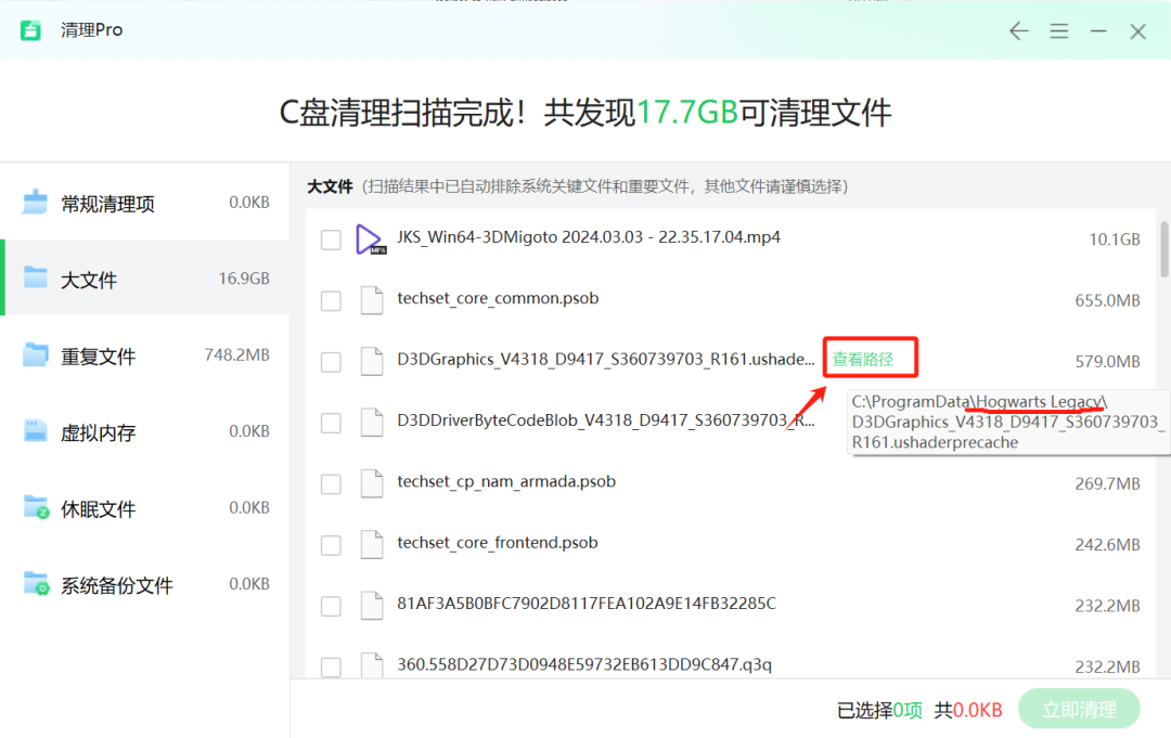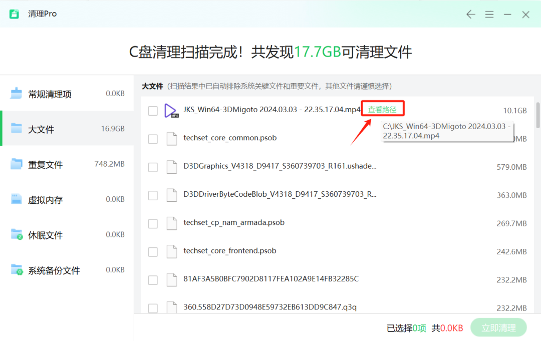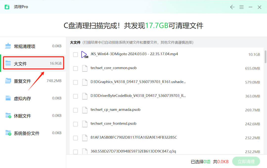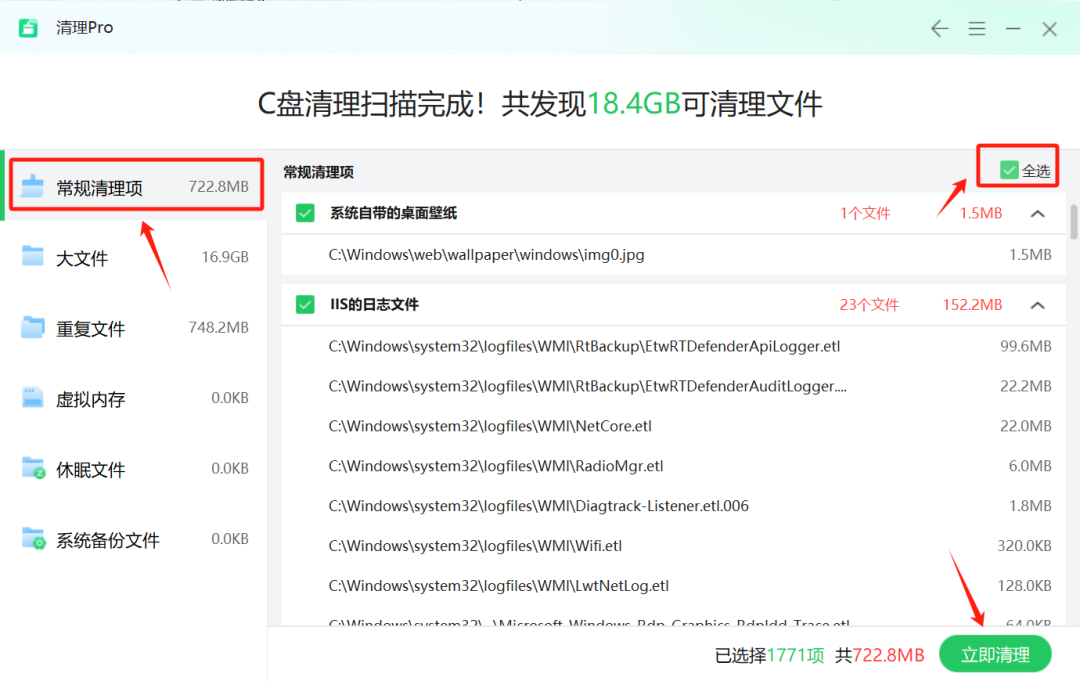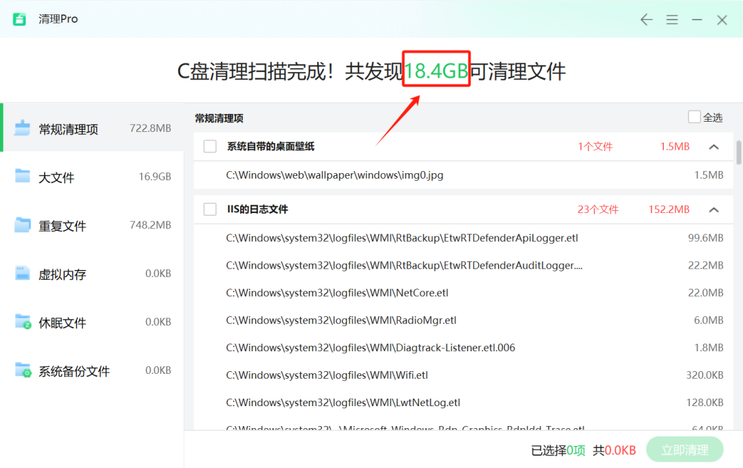 这里可以看到,它一共扫描出18.4G可以清理的文件。