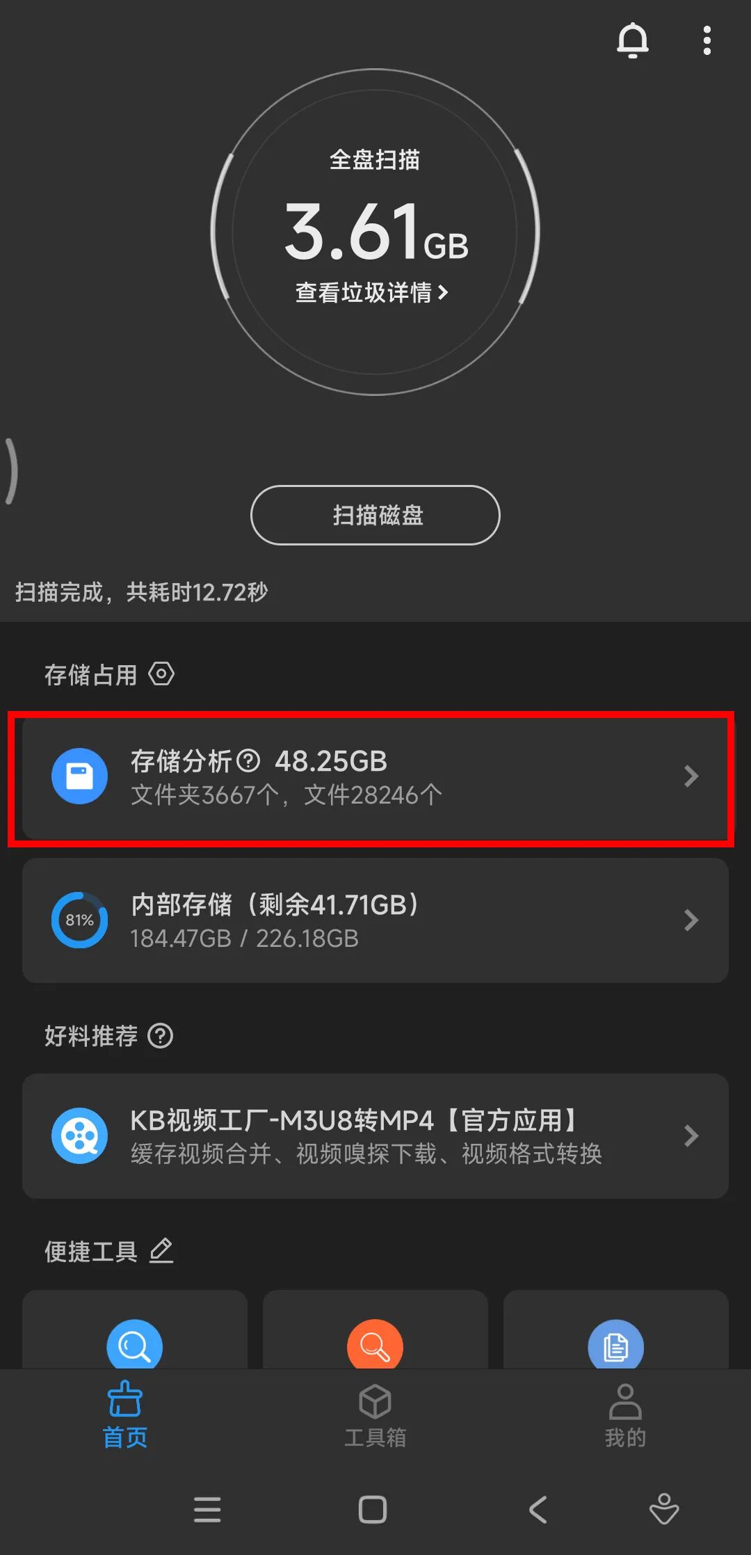 当然,常规清理,肯定是解决不了核心问题的。所以,我们需要用到另外一个功能:存储分析。