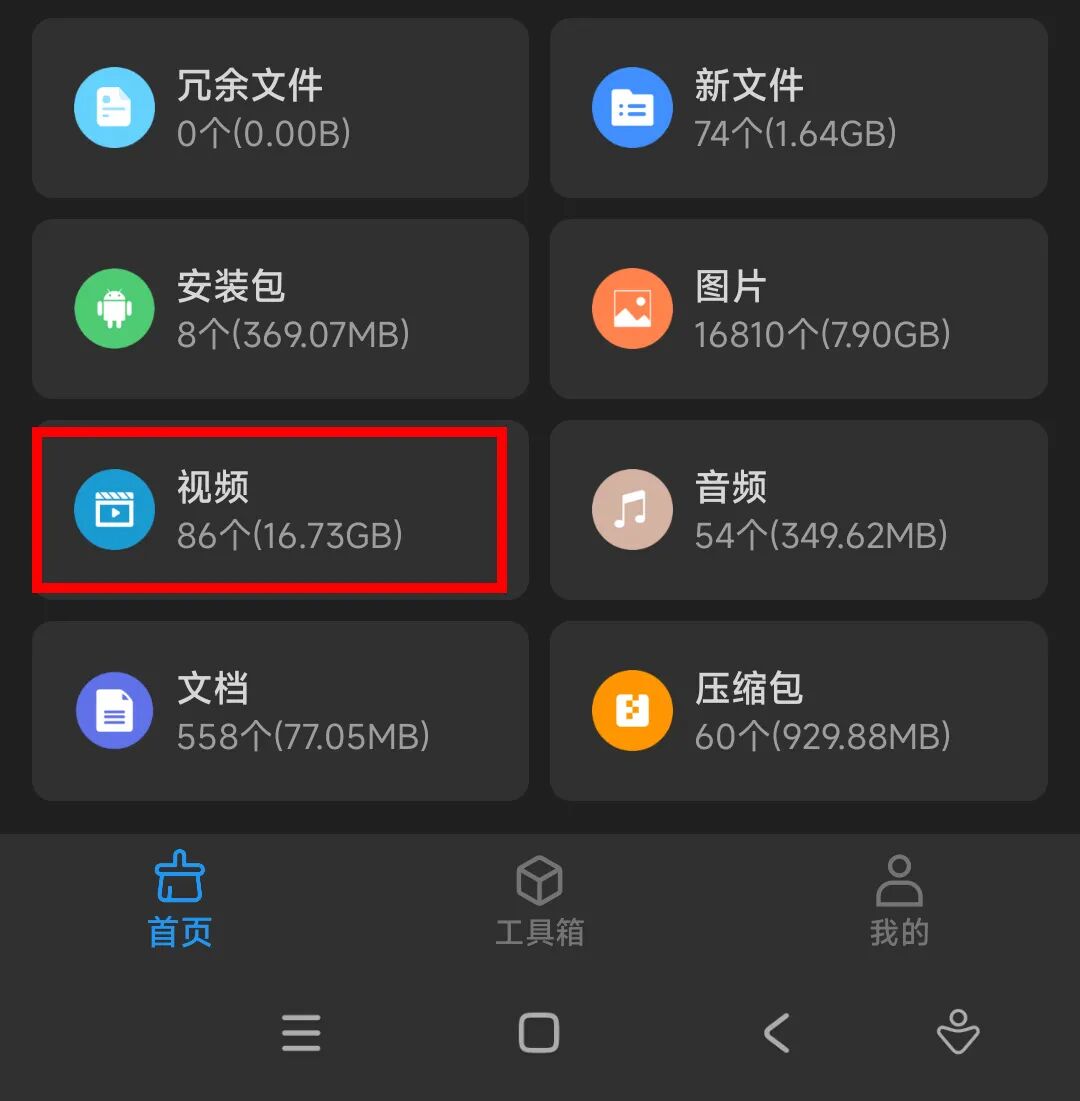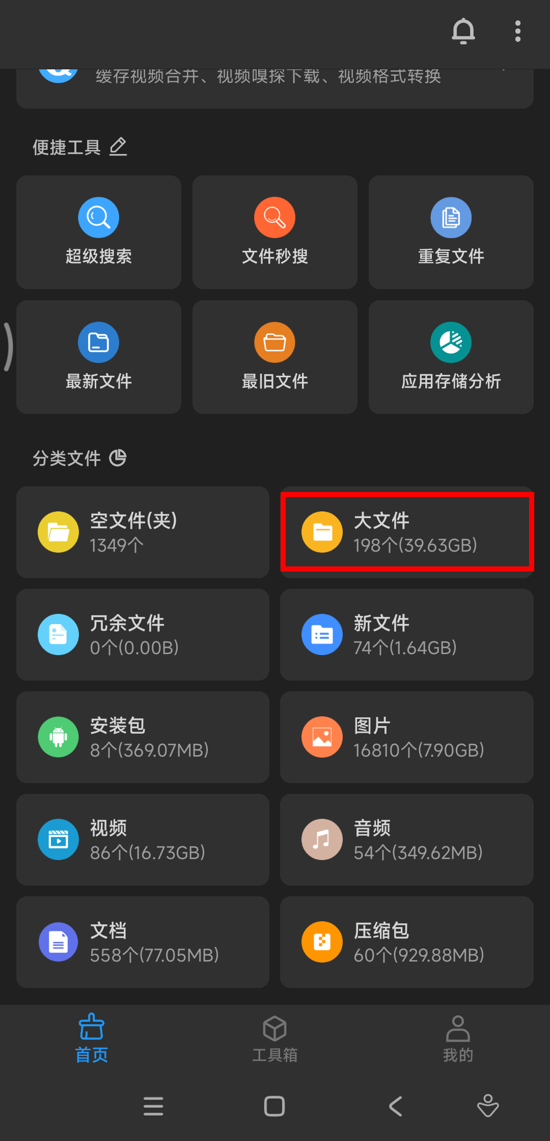 如果想快速释放手机空间,最简单的方法,是点击底部的大文件。