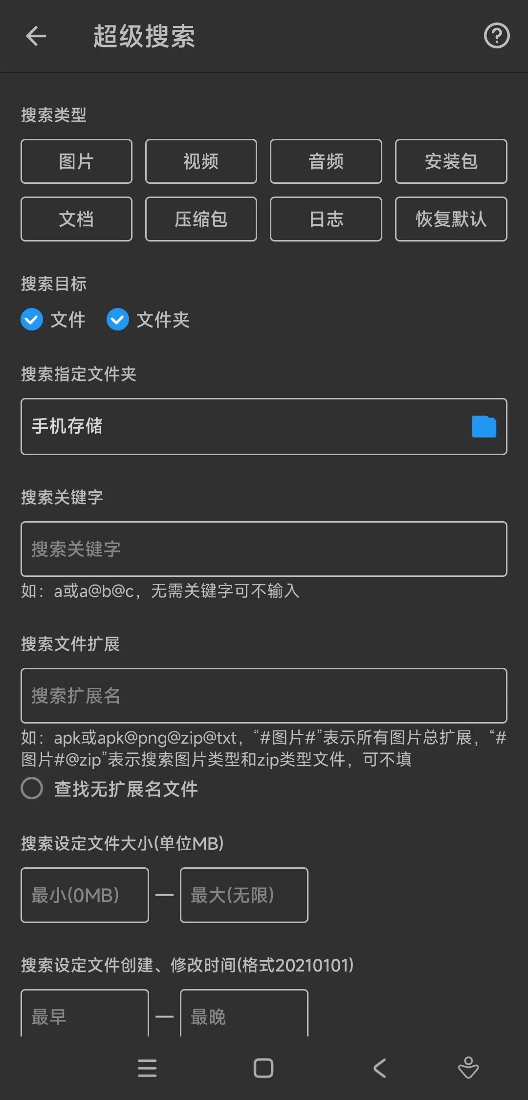 这里可以对各种类型进行筛选、包括具体的文件名称,文件夹名称,甚至是扩展名等都可以进行精确搜索。