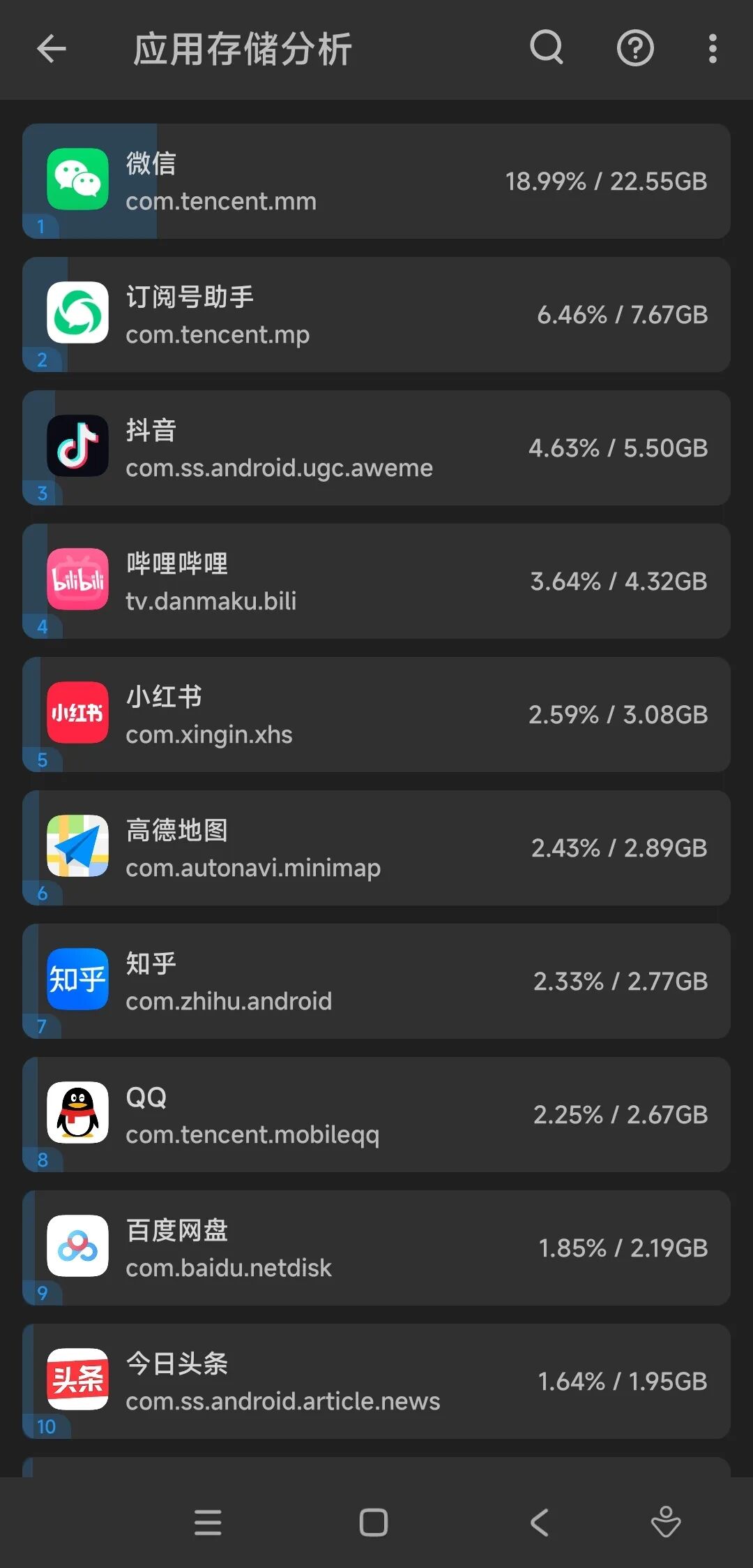除此之外,应用存储分析也能帮助我们了解哪些APP比较占空间: