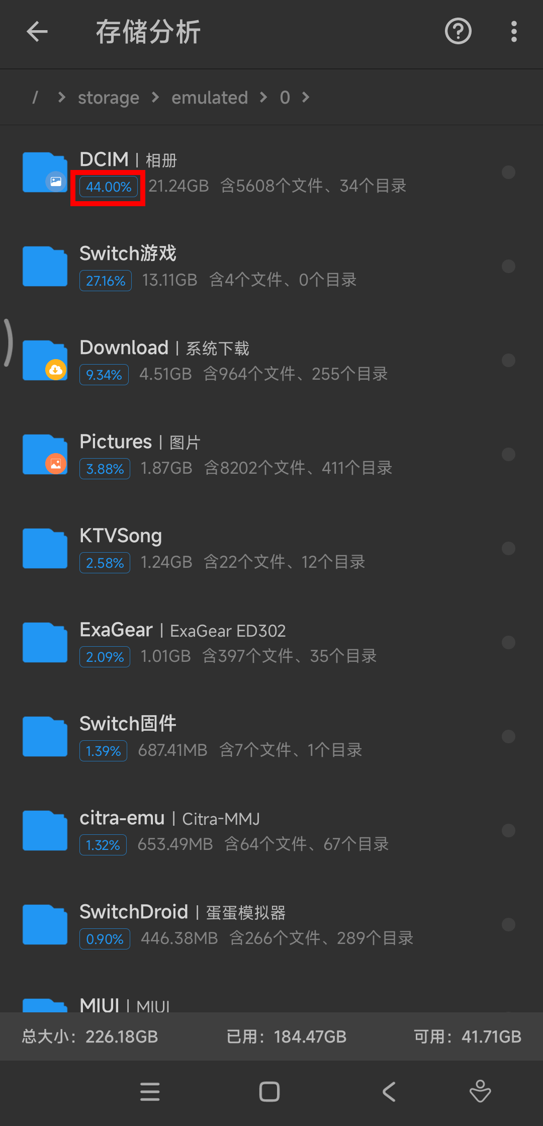 这里,会对手机里的每一个文件夹进行容量占比换算,比如刺客的手机当中,占比最高的是相册,这是因为很多录屏演示都保存在手机相册里面;其次,便是Switch游戏资源: