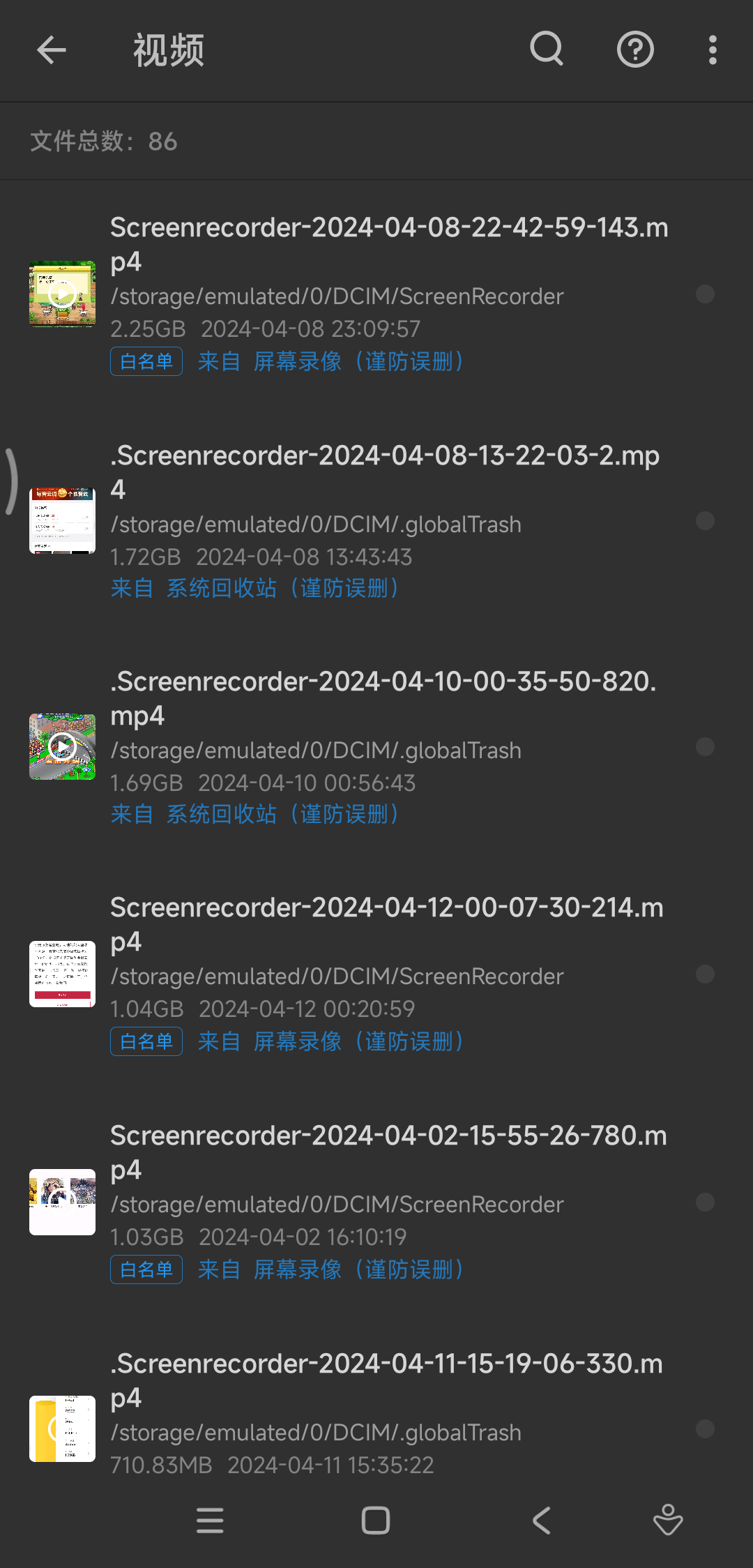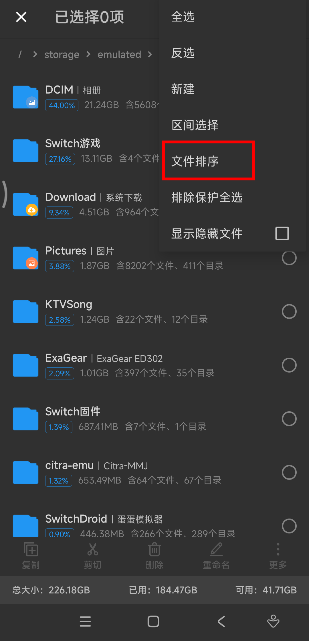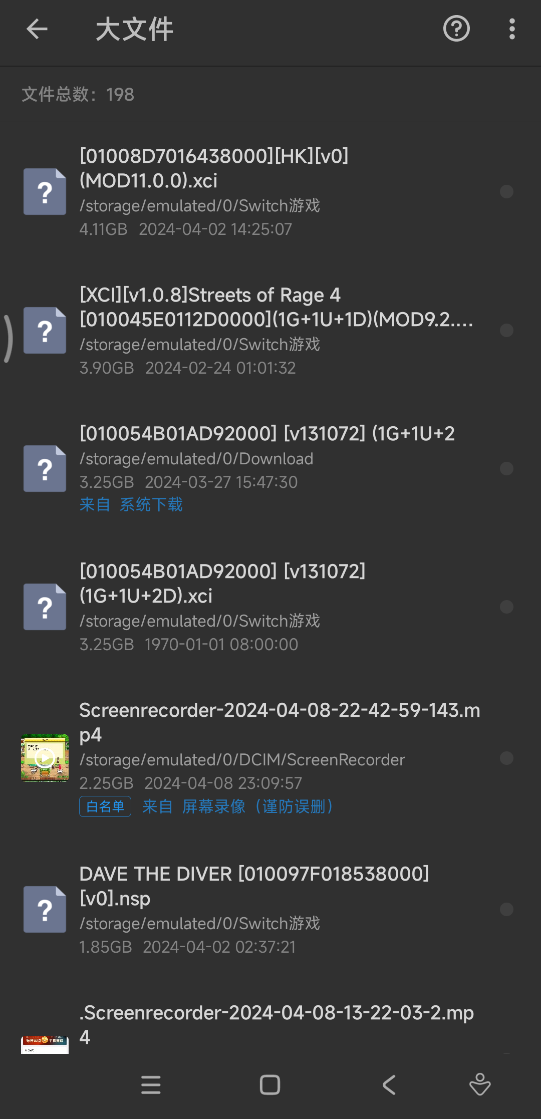 这里,默认是按照文件大小进行排序,可以看到,这些大文件主要是由switch游戏和视频文件构成: