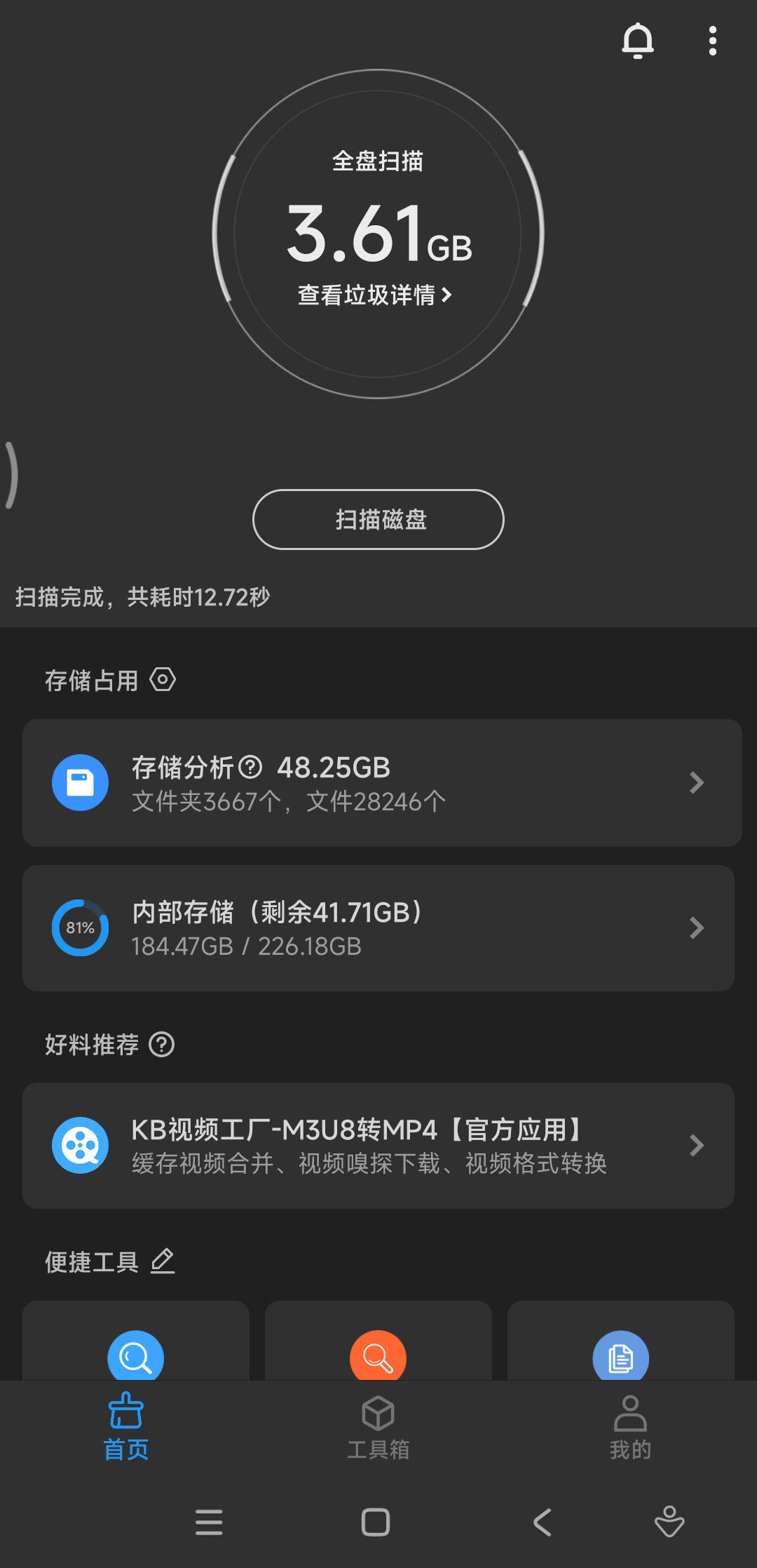 内容一经发出,便得到了小伙伴们的一致好评,与此同时,也有不少朋友找到刺客,询问手机上有没有同类工具;考虑到大家的需求,刺客今天,就为大家安排一款相当好用的手机清理软件APP!它同样小巧轻便,不仅可以一键快速清理,更是提供了存储分析、大文件、重复文件筛选,以及文件管理器、文件秒搜、聊天工具专项清理、音视频剪辑等诸多功能!同时,也是完全免费,没有任何广告,更是无需注册登录即可使用,妥妥的神器本器!