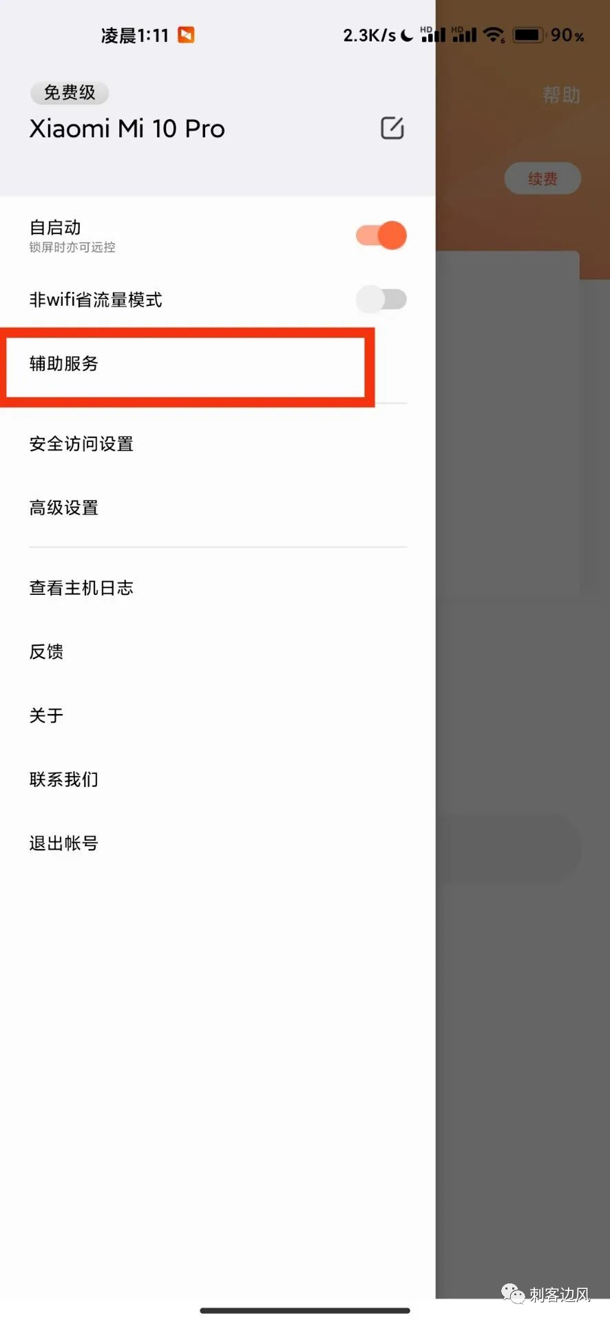 但这还没完。因为仅仅看,是没用的,我们还需要直接控制公司里的那部手机进行钉钉打卡操作。在被控端App里左侧边栏中找到“辅助服务”: