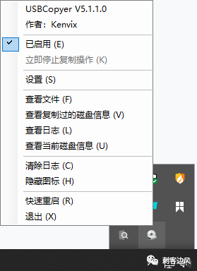 首先,下载刺客提供的资源包,以管理员权限运行.exe主程序,启动后不会弹出主界面,电脑右下角状态栏里可以看到USBCopye图标,当然,如果你想更彻底、更隐蔽,可以索性将状态栏的图标隐藏,你懂得。