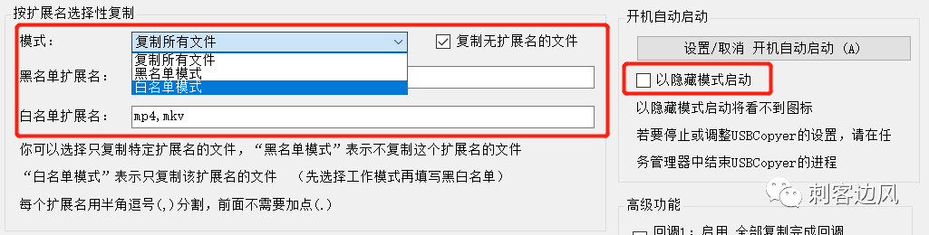 同样,如果你需要视频,比如想拷贝mp4的文件,那就找到模式设置中的白名单、黑名单,然后将模式修改为白名单,在扩展名列表中输入mp4;反过来也可以操作,比如不想要拷贝大容量的视频文件,就在黑名单里输入mp4就可以了。