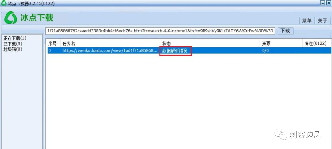 关于文库下载工具,刺客之前也分享过不少,其中最出名,同时也是最好用的,估计还是冰点文库,虽然作者很早就已经停更闭站了,但软件经某些大佬的修改,还可以正常使用,然而,最坏的情况还是发生了....,刺客最近在使用时,发现已经无法用了,一直提示解析失败,差不多就是下面这个样子。