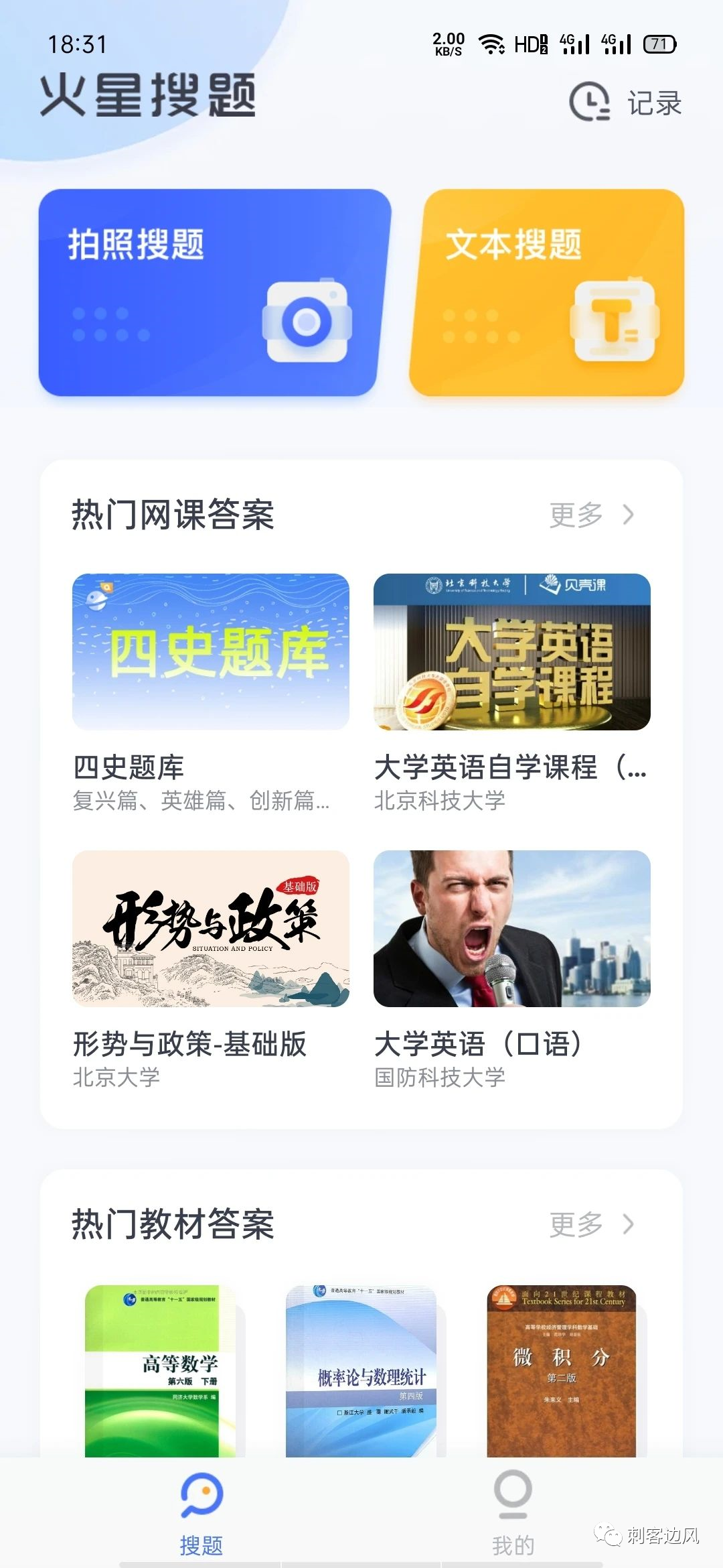 火星搜题,一款专为大学生开发的搜题软件,本身相当硬核,而且已经解锁SVIP权限,并且全程没有任何广告,打开主界面会看到两大分类:“拍照搜题”和“文本搜题”:
