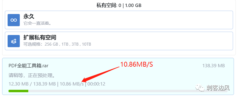 接下来,我们就实际演练一下,首先上传文件,坦白说真的很快,轻轻松松冲到了10Mb/s,嗨皮,尤其是不限制文件大小这一条,绝对可以封神。