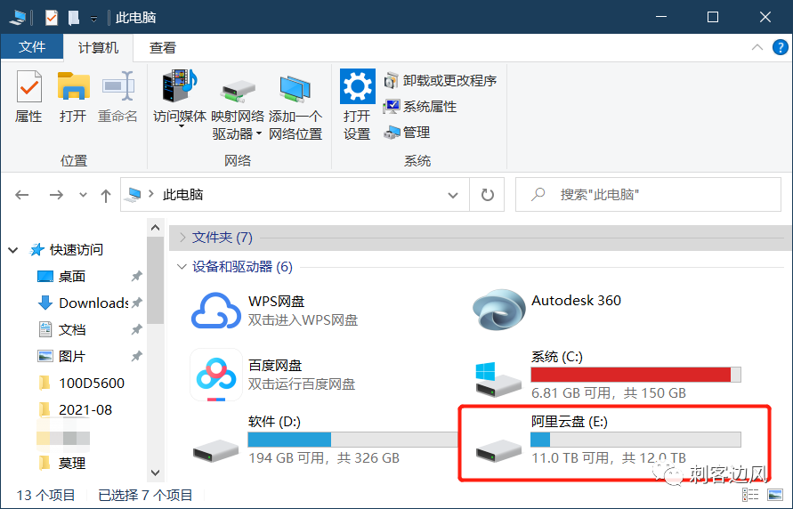 登录之后,你会发现在自己的硬盘里会多出来一个盘符,也就是我们刚刚挂载的阿里云盘,它就已经变成你的一个远程硬盘,惊不惊喜,意不意外?
