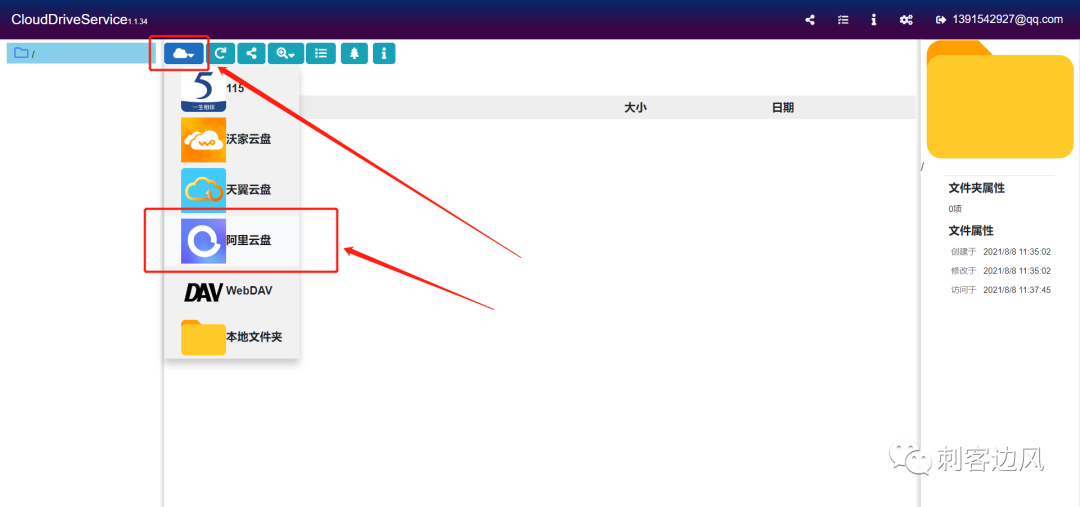 接下来就是重点了,在左上角位置云朵的位置,点击下箭头,弹出的网盘里,选择阿里云盘并登录。