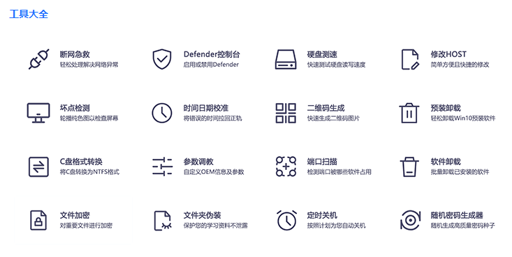 其他功能都比较简单,不一一展开了,重点要介绍这个“工具大全”,点开后,会看到16个实用工具,包括:断网急救、硬盘测速、二维码生成、文件夹伪装、文件加密等等,相信很多小伙伴都会用得到。