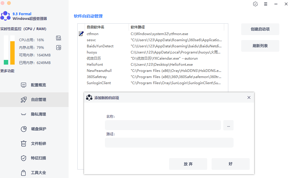 再看第二个:自启管理,这其实就是开机启动管理,可以管理各类程序,决定是否开机自动运行,甚至可以自定义设置,找到对应的程序地址,再勾选“创建启动项”,直接搞定。