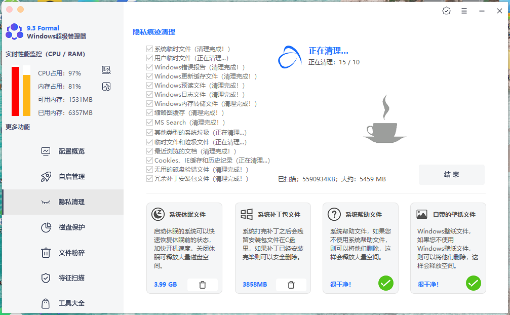 隐私清理,相当于系统垃圾清理,可以有效清除多余的缓存文件,甚至是个人隐私痕迹,既可以解决电脑卡顿、拖慢问题,又可以保护个人隐私,你懂得。