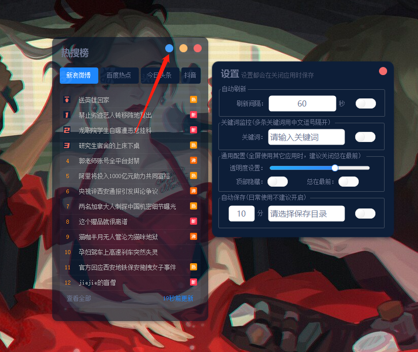 热搜榜小工具,一款电脑上使用的插件工具,软件本身容量只有1MB,但你可别小看它,毕竟它集合了今日头条、微博、百度、抖音四大平台的热搜榜单,并且还是实时更新的,就问你们,强不强吧?