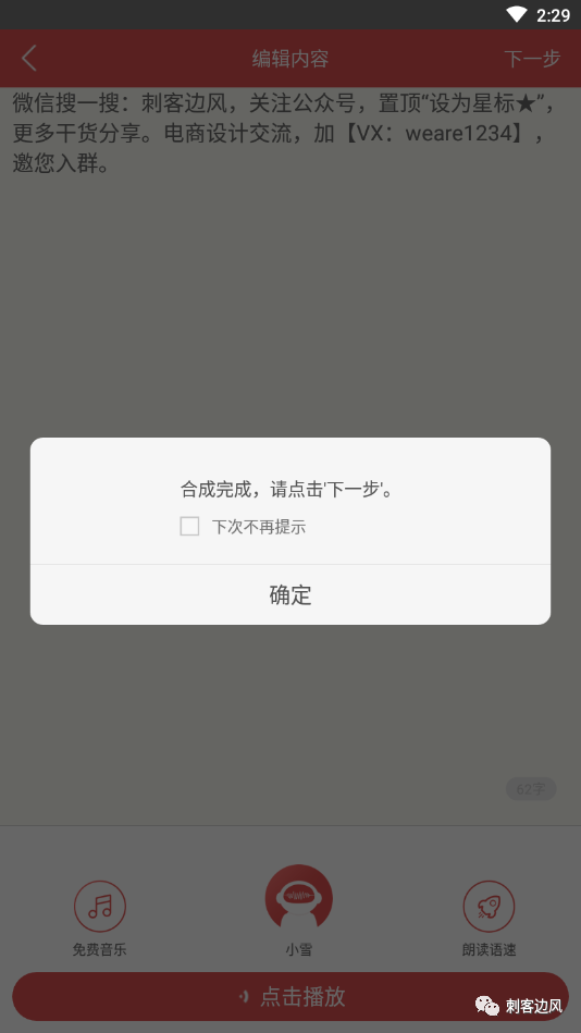 播放后,会提示合成完成,这个时候,点击右上方的“下一步”。
