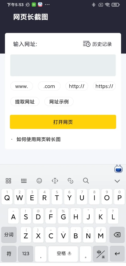 估计大家最感兴趣的,还得是这个网页长截图吧,毕竟懂得都懂啊!使用起来也很简单,只需要输入想要采集的网址,点击“打开网页”: