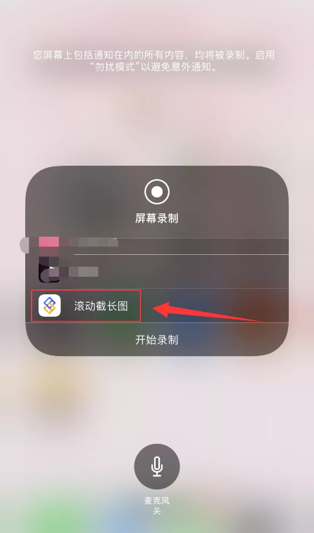 在弹出“屏幕录制”的界面后,选择本软件,再点击“开始录制”,这时就按录屏的方式从上往下滑动操作即可: