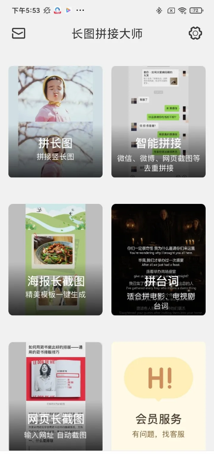 五个功能一个比一个逆天:拼长图、智能拼接、海报长截图、拼台词、网页长截图,如字面意思,都相当好理解:
