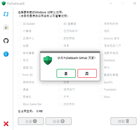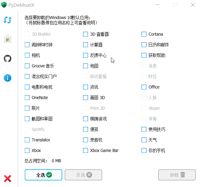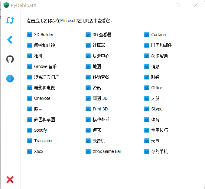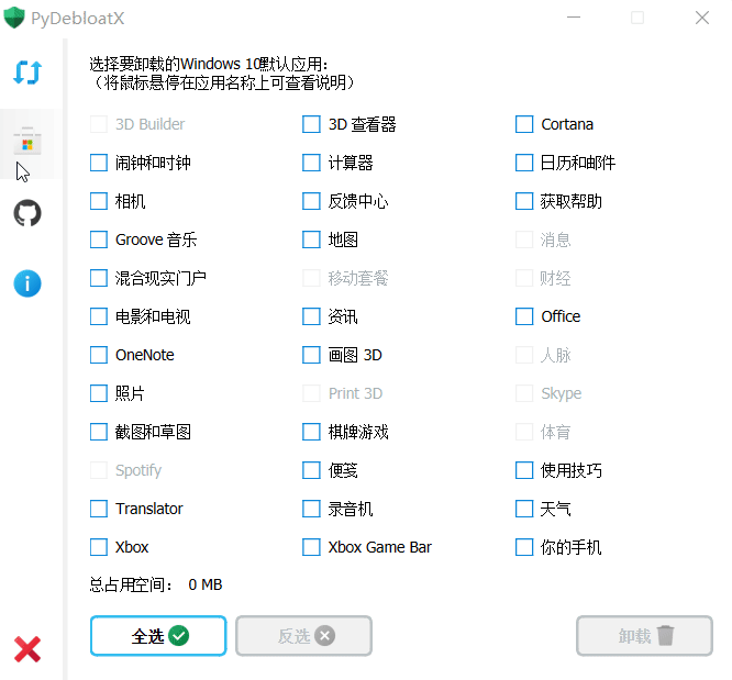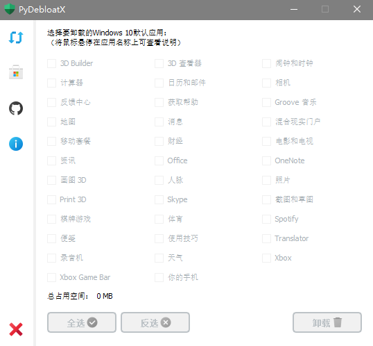 PyDebloatX,这是一款非常实用的电脑系统工具,可以快速卸载那些鸡肋的默认程序,比如:时钟、资讯、录音机、地图、天气、相机、邮件等等。