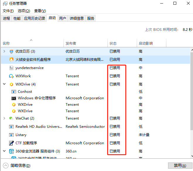 其次,进入【任务管理器】,点击【启动】按钮,将右侧所有程序,右击选择【禁用】,点击确定。