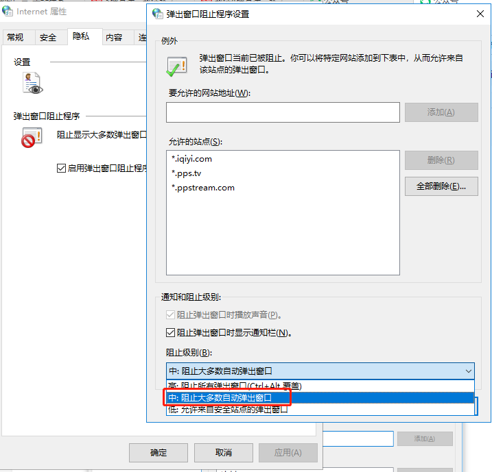 在Internet属性窗口中,选择【隐私】,然后勾选【启用弹出窗口阻止程序】,再进入下一步【设置】,将【通知和阻止级别】调整成【阻止绝大多数弹窗】,点击右下角确定按钮,就可以有效阻止弹窗广告了。