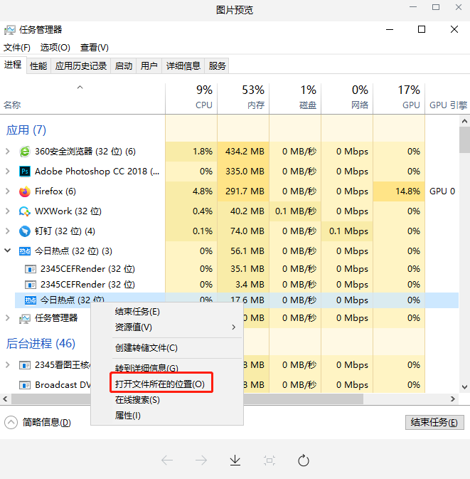 然后我们双击今日热点,在弹出的下拉菜单中可以看到今日热点和2345,这时我们对今日热点按鼠标右键,选择打开文件夹所在位置。