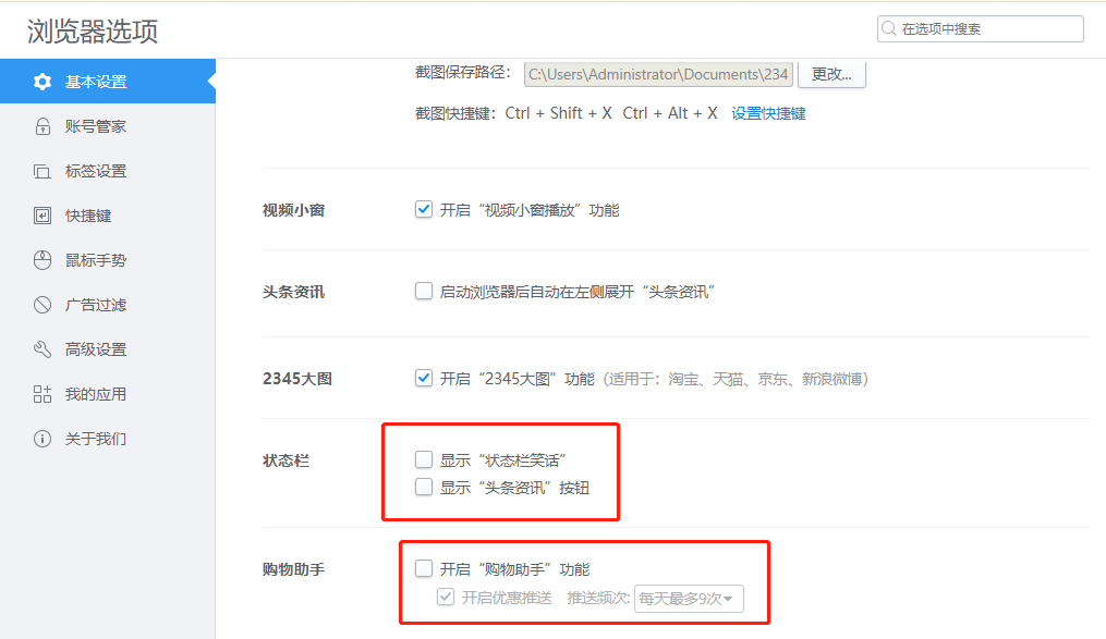 最后,我们在2345浏览器的设置里,找到广告显示的位置,取消诸如各种购物、状态等的勾选项目,关机重启电脑,弹窗广告就会彻底消失。