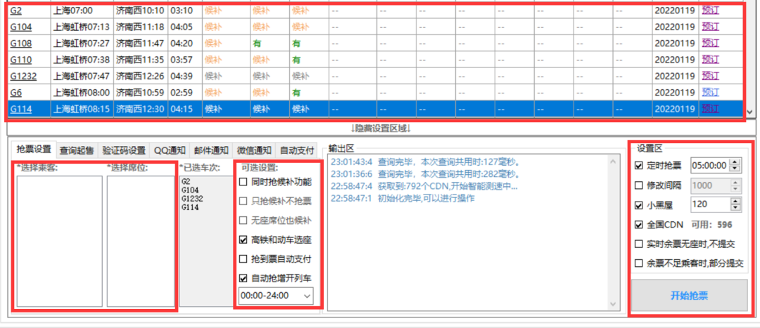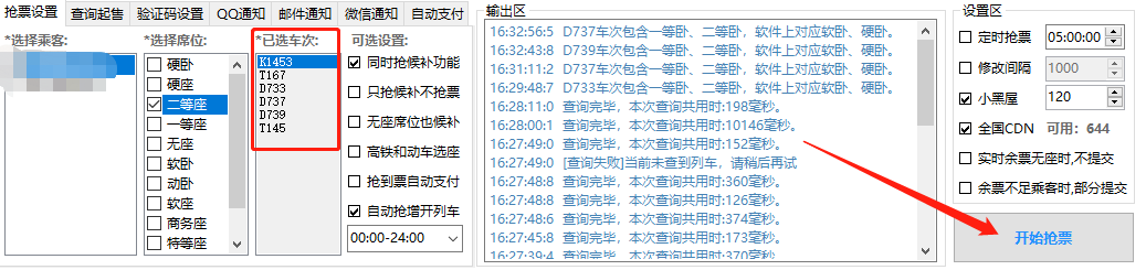 全部设定好了,点击右下角的“开始抢票”,然后就啥都不用管了。