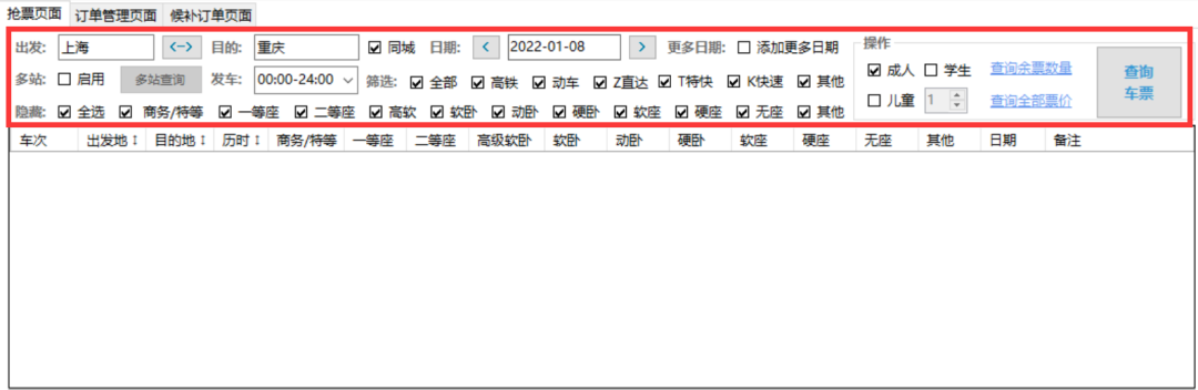 之后便可一键查询,如果碰到不错的列车班次,双击,即可将其添加到待抢列表中: