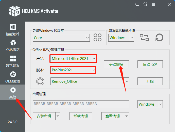 这个可以说是最简单的了,打开刺客今天提供的KMS Activator,在左侧栏的“其他”里,按下图所示设置,然后点击“手动安装”按钮: