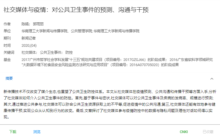 点开后,可以清楚的看到相关内容,包括:作者名称、单位名称、期刊、时间、关键词等等,一应俱全: