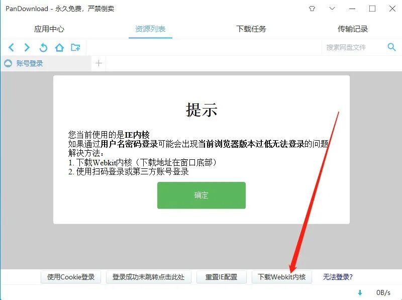 首先登录网盘账号。登录时若出现“IE内核版本过低”的提示语,请点击下方下载“Webkit”内核,下载后会自动安装,这时先退出软件。