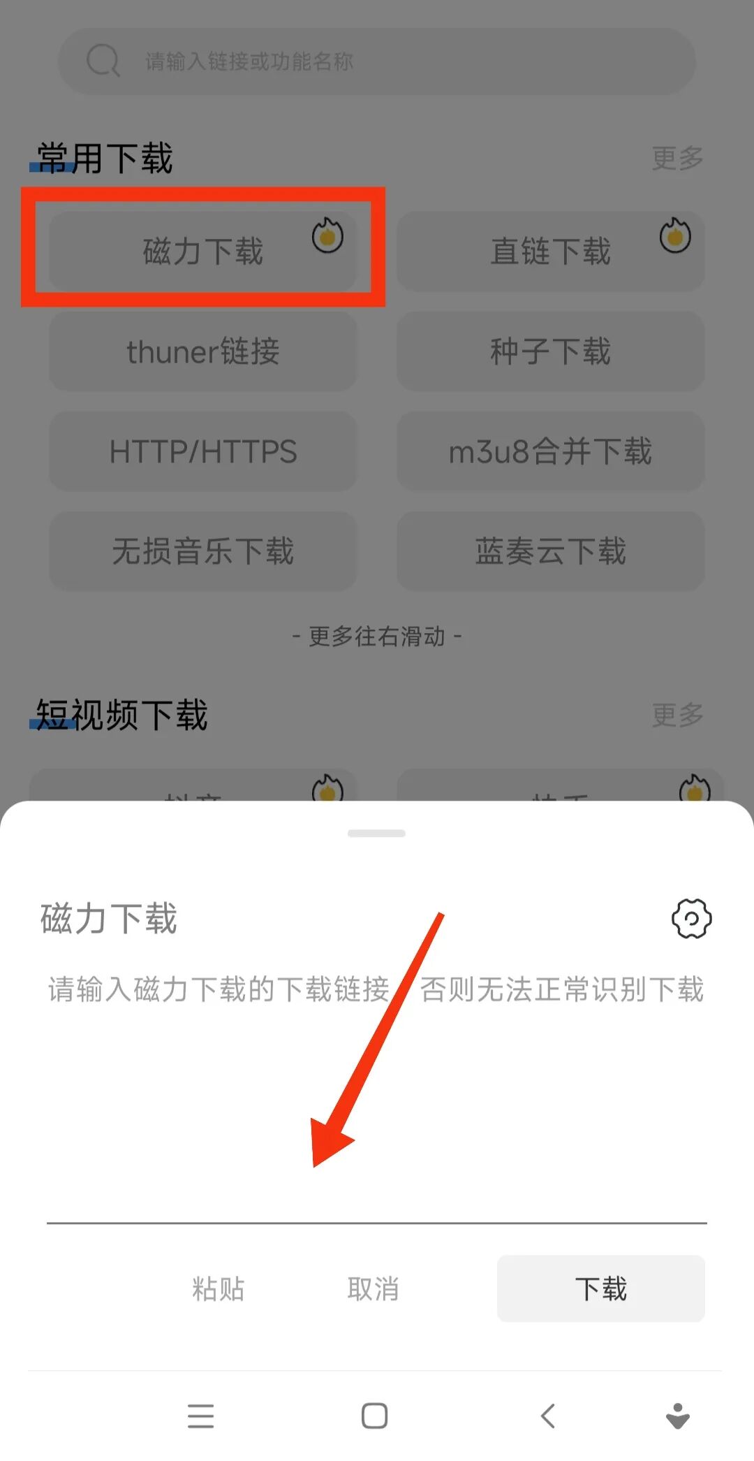 我们就继续拿磁力说事好了,点击“磁力下载”,在弹出的输入框里粘贴磁力链: