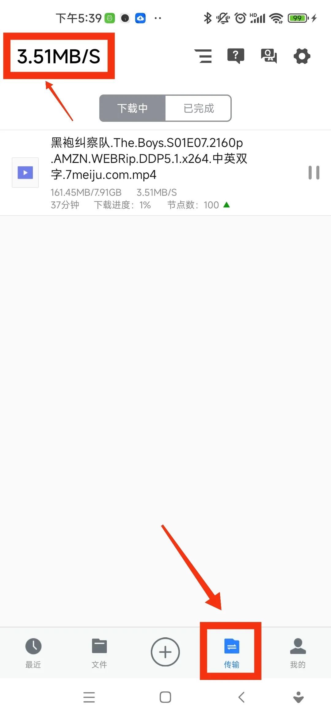 刺客这里以高速下载为例,点击后,前往底部导航里的“传输”,可以看到,即便是这种已经不怎么热的资源,下载速度,依旧能稳定的保持在3.5Mb/s以上:
