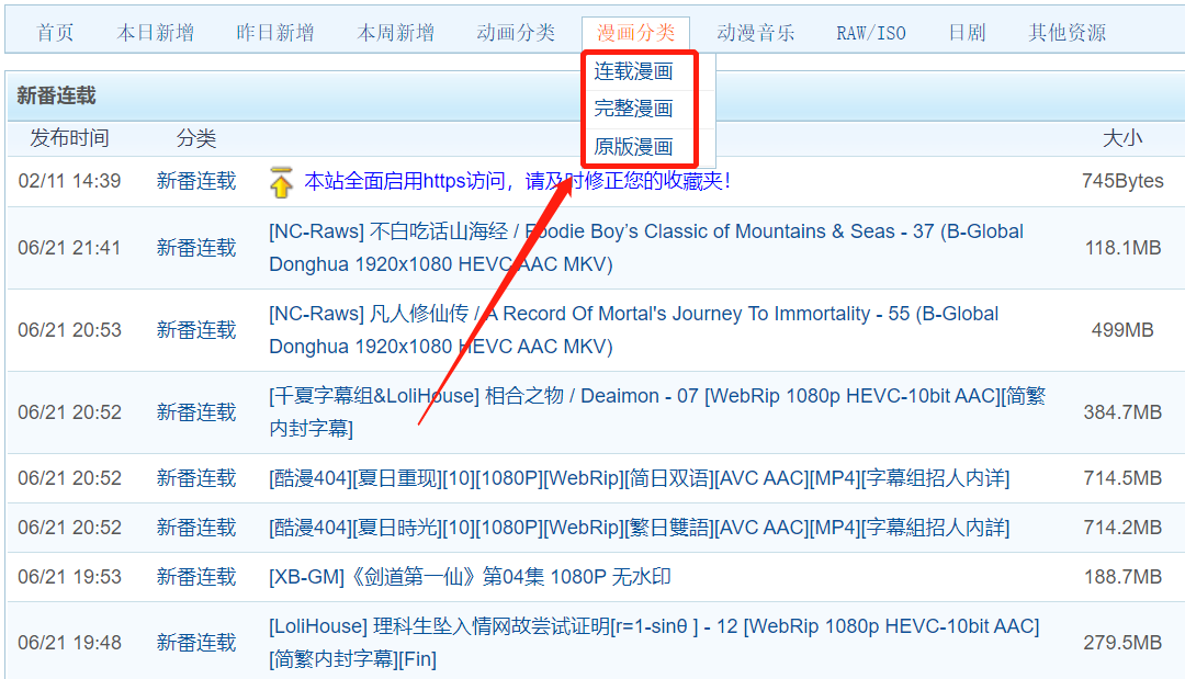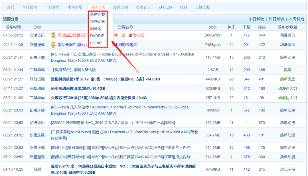 我们以动画分类为例,当鼠标划动到身上,甚至会弹出下拉菜单,包括有:新番连载、完整动画、剧场版、DVDRIP、BDRIP: